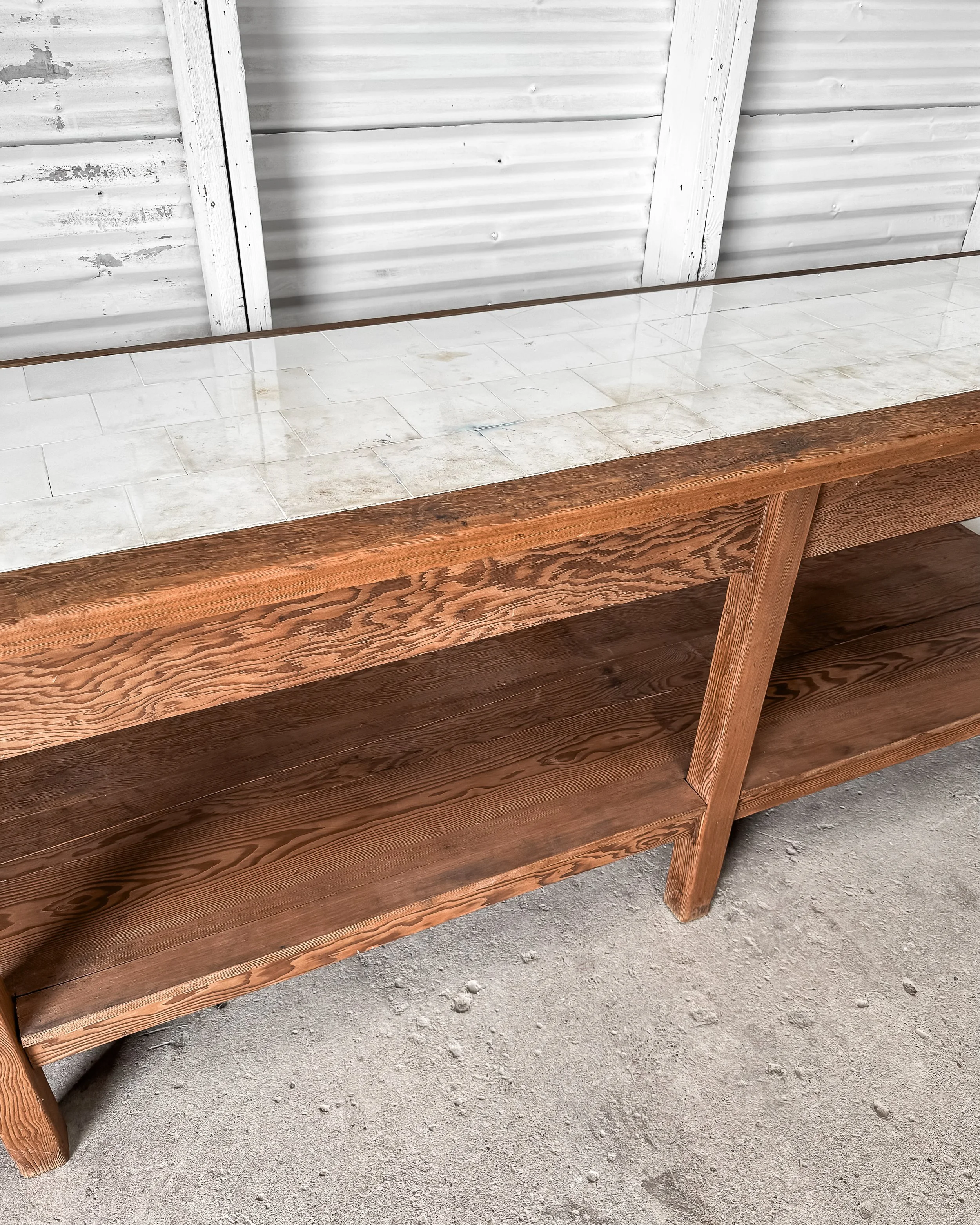 This 19th-century laboratory table, sourced from Liege University in Belgium, has been reimagined as a handsome kitchen island that effortlessly combines history with modern functionality. Crafted from natural wood, the table features a lower shelf perfect for storing kitchen essentials, providing practicality and charm. The original tiled top, handmade by the renowned Villeroy & Boch, remains intact with its off-white, creamy tones. It showcases a beautiful patina with signs of crazing, cracking, and staining that speak to its storied past.