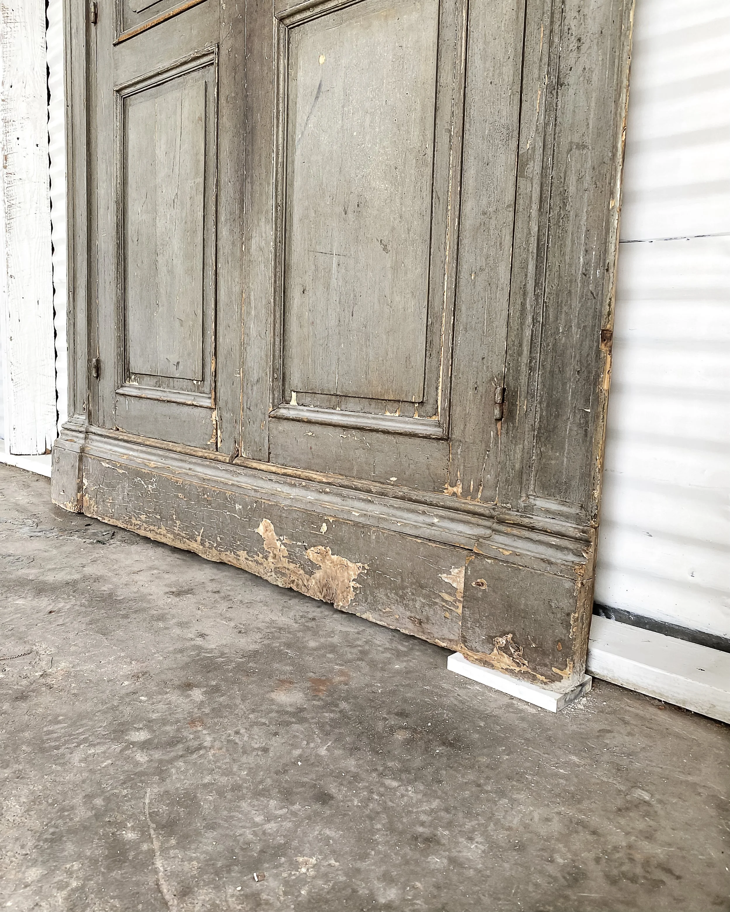 The worn layers of green paint have aged with a graceful, unmatched patina that can only be achieved over time. Each of the doors open to reveal a large space inside, ready to enclose a one-of-a-kind closet or pantry. Install in the kitchen, bathroom, or at the end of the hall, to create a jaw-dropping focal point in your home.
