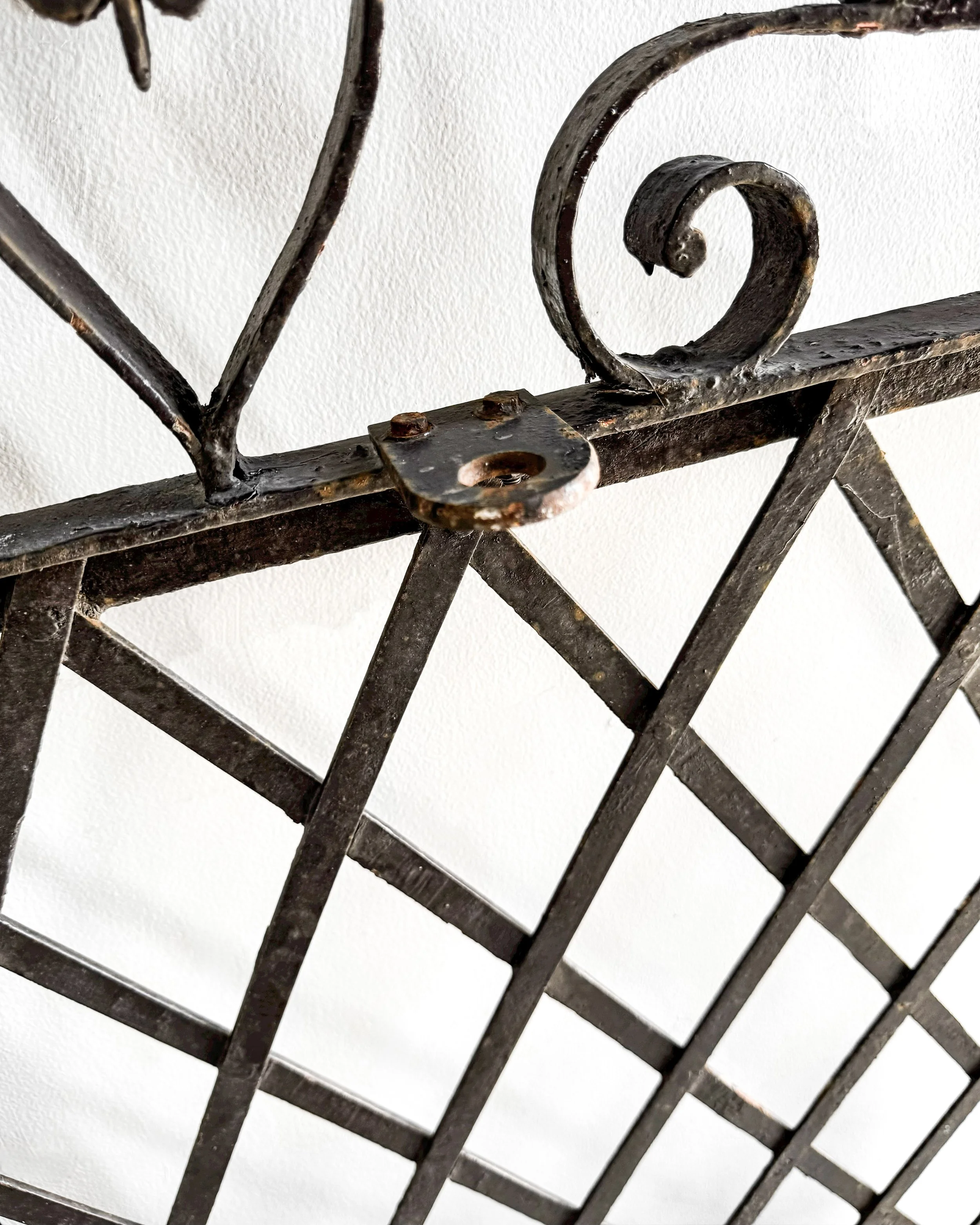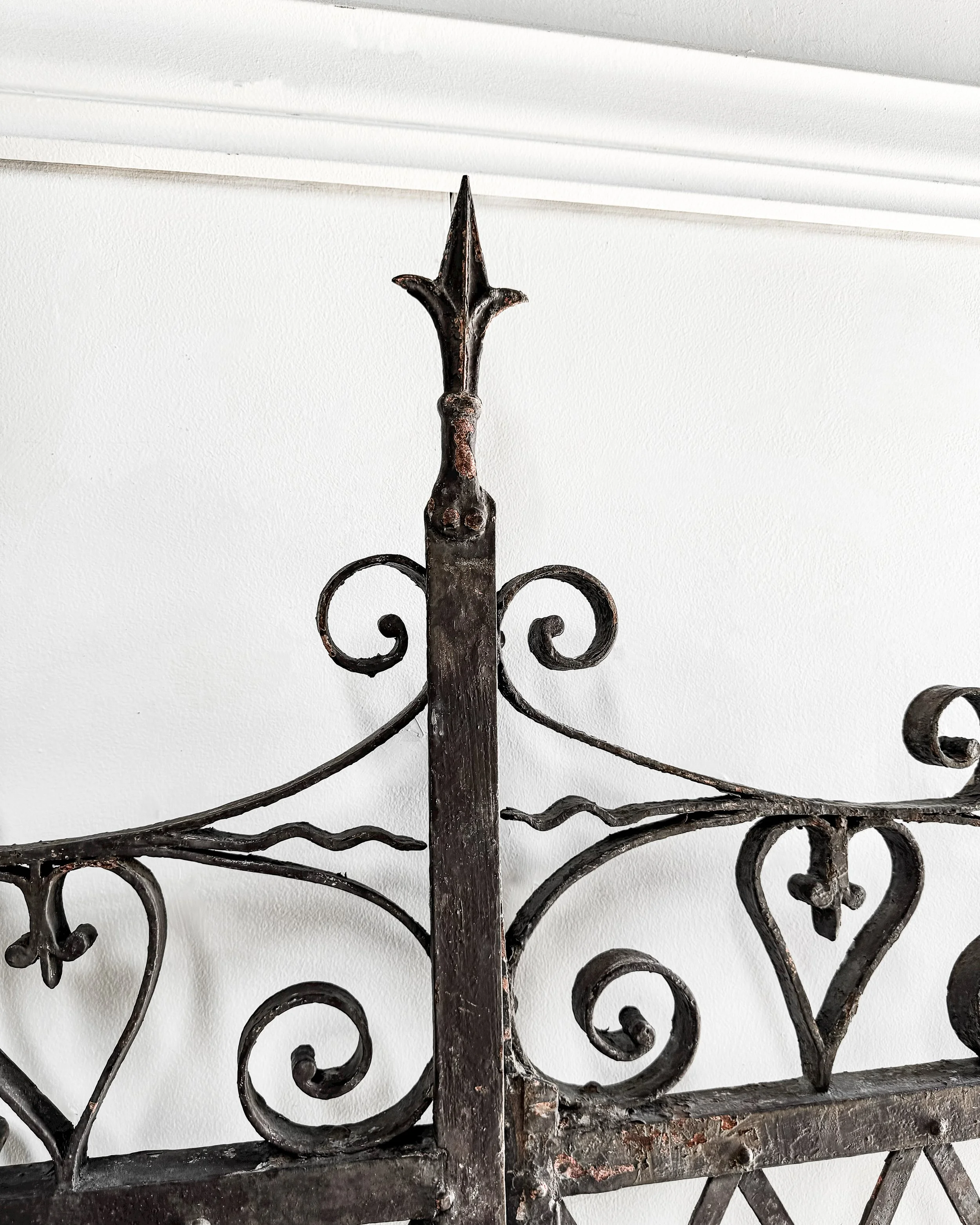 At the center, a fleur-de-lis finial is a striking focal point, flanked by intricate scrollwork and heart-shaped motifs that soften the overall structure with a touch of romance. The ironwork, showing minor hints of a reddish hue, reveals its history of being painted at some point, lending a subtle patina that speaks to its age and character. These gates would make a graceful yet bold statement in any garden or entryway setting, blending functionality with timeless style.