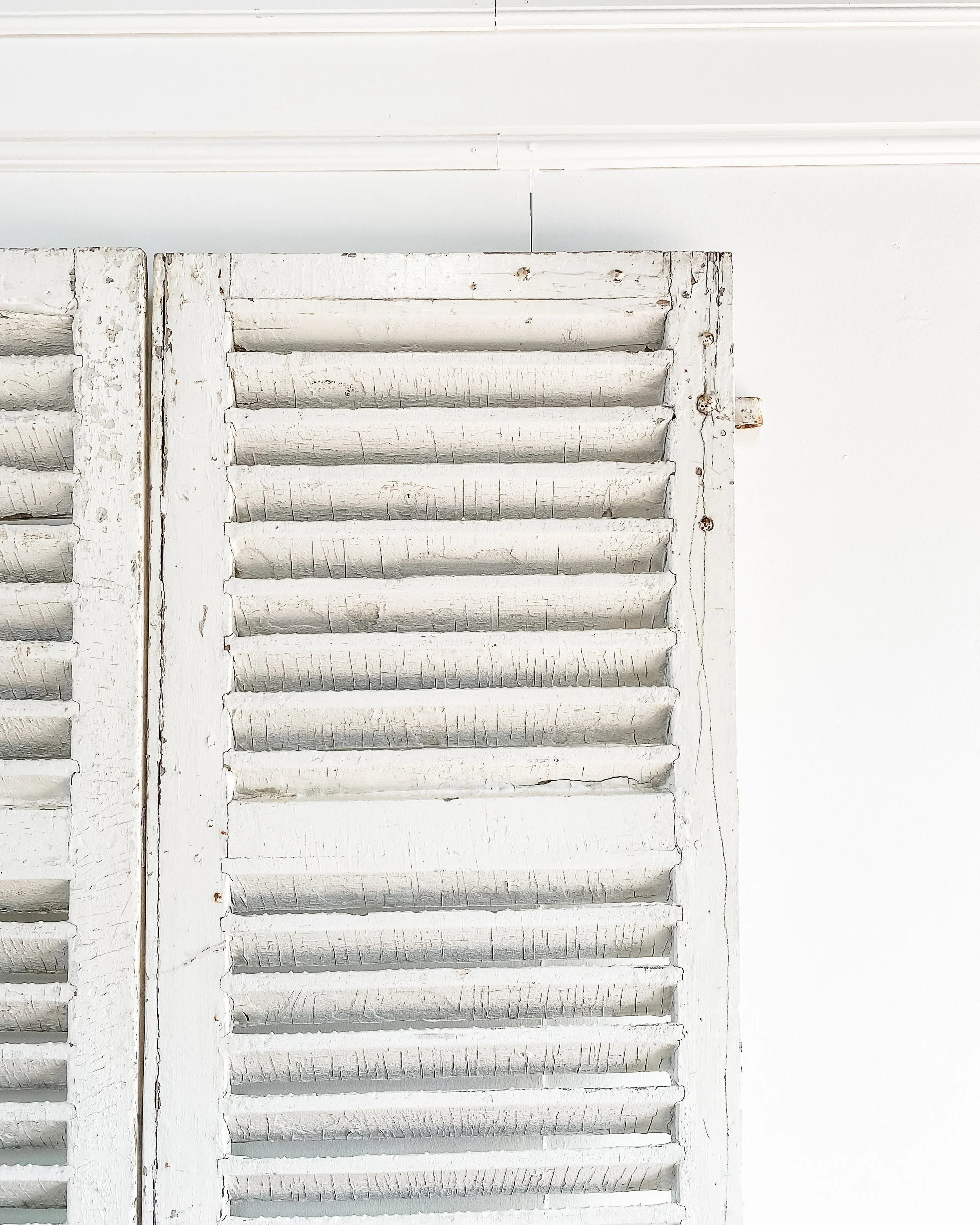 A pair of salvaged weathered white shutters with original paint and iron hardware, found in France. Use as decorative window treatments or attach them to sliding door hardware as a functional pair of doors.