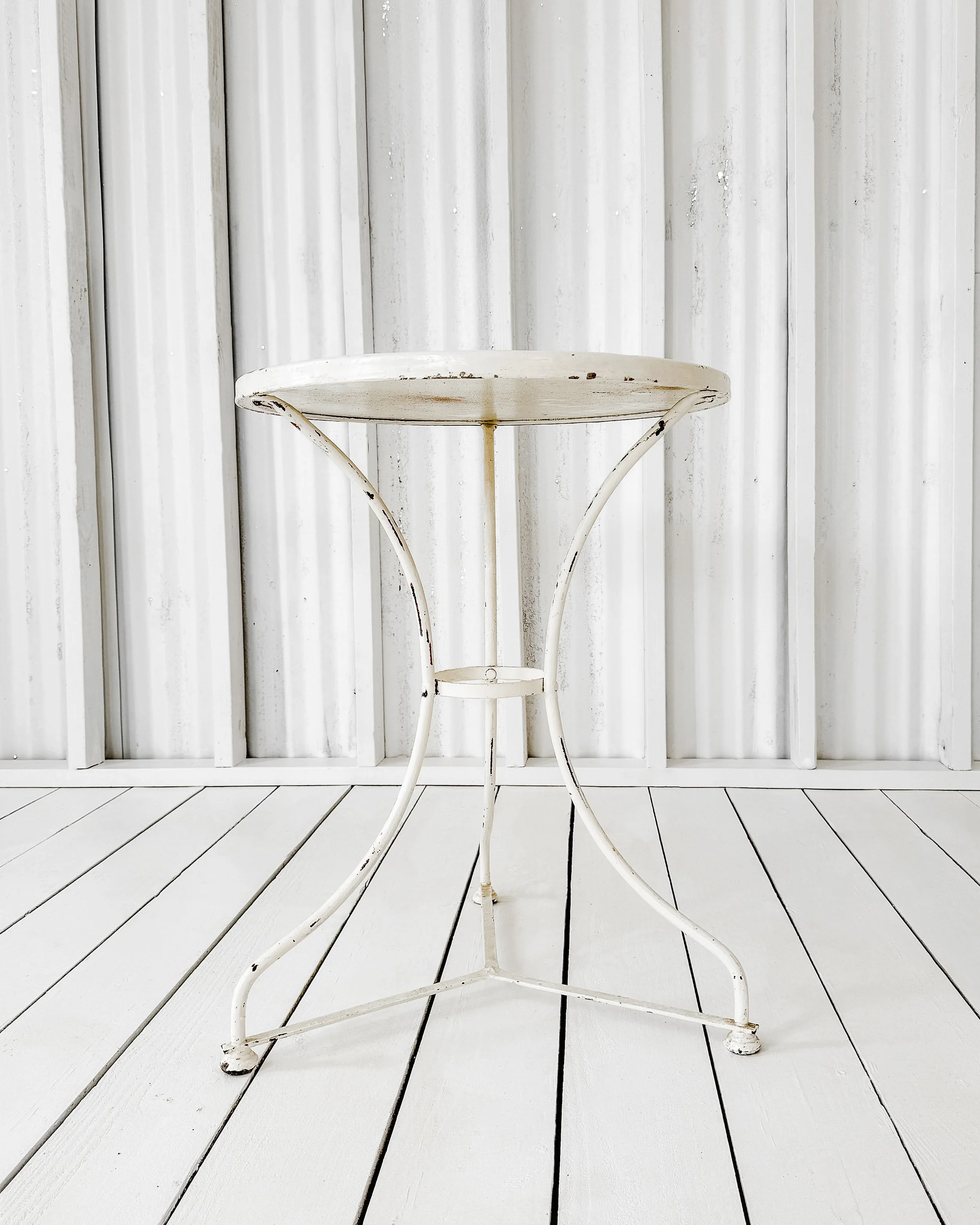 Simple and chic in design, this old bistro table would be great for use as a bedside table, as an accent table in the living room, or as a dining table for two in the garden. Topped with an old Carrara marble top, the wrought iron base bears the original white paint showing character marks from years of use.